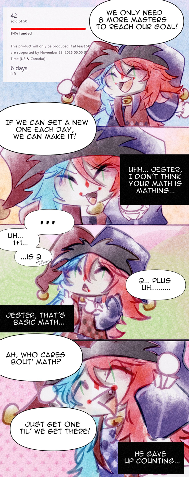 I IMMEDIATELY WENT FOR THE PLUSHIE AS SOON AS I CAN!!! Anta, I love LOVE your projects, especially Trapped with Jester. Hopefully u reach ur goal!! :DDD